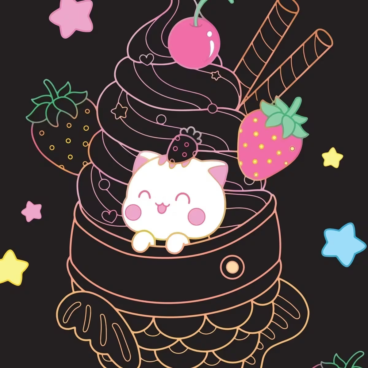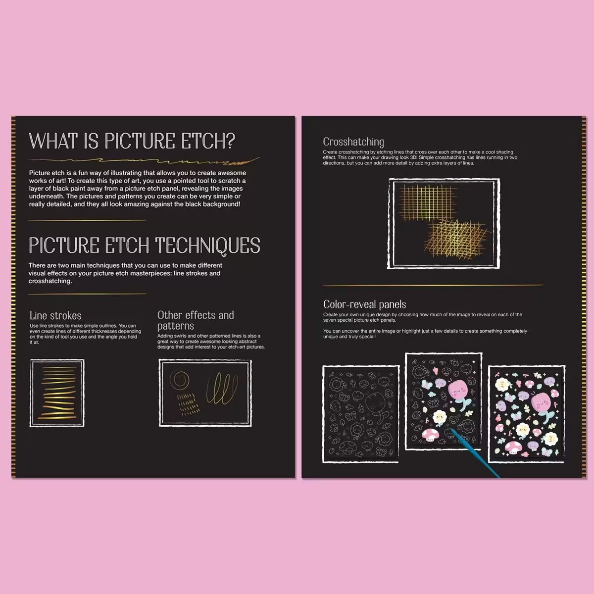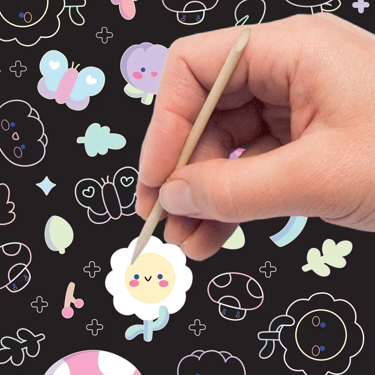 discover bright Kawaii patterns and images hidden underneath. It’s up to you: you can scratch away all of the black layers, reveal a few details that you want to highlight or create your own patterns on the beautiful images inside.
