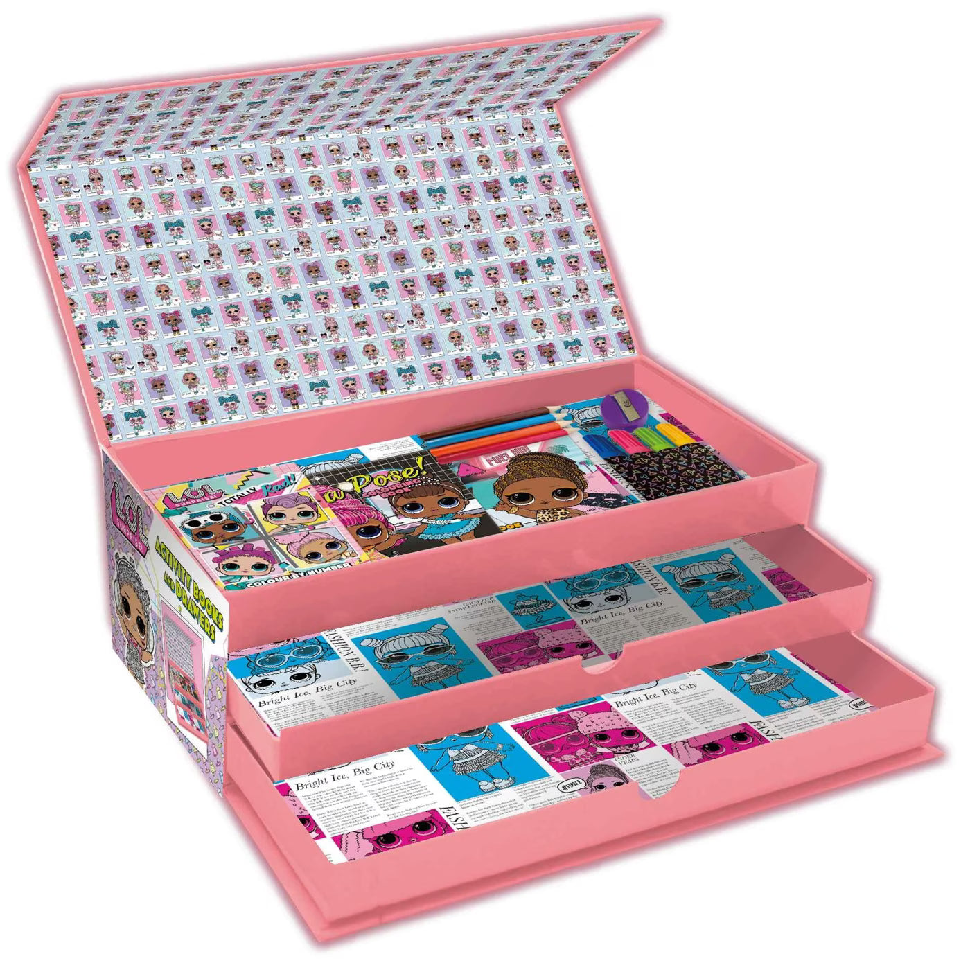 This exciting format is stuffed full of colouring and activity fun. Children will delight in storing their artworks and supplies in the gorgeous, portable keepsake drawers!Includes: 3 mini colouring & activity books, 4 coloured pencils, 4 felt-tip markers and a pencil sharpener.